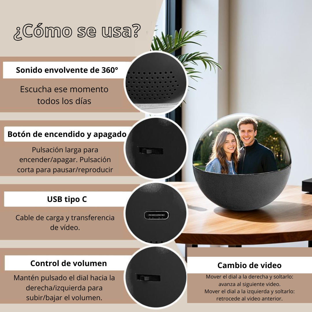 Revive tus recuerdos con sonido 360°; gira el dial para cambiar videos y ajusta el volumen fácilmente con USB-C.